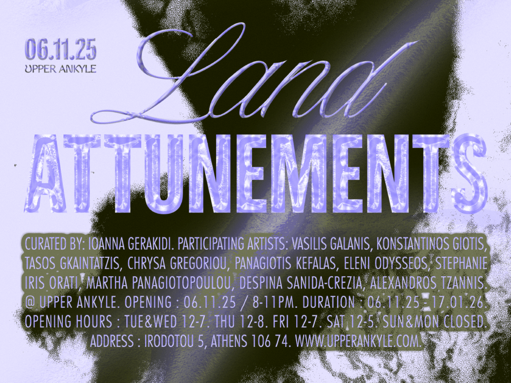 Upper Ankyle, the new artist-run space in Athens, presents from November 6, 2025, to January 17, 2026, the group exhibition Land Attunements, featuring works by Vasilis Galanis, Konstantinos Giotis, Tasos Gkaintatzis, Chrysa Gregoriou, Panagiotis Kefalas, Eleni Odysseos, Stephanie Iris Orati, Martha Panagiotopoulou, Despina Sanida-Crezia, Alexandros Tzannis, curated by Ioanna Gerakidi. The exhibition opening will take place on Thursday, November 6, at 8pm.
