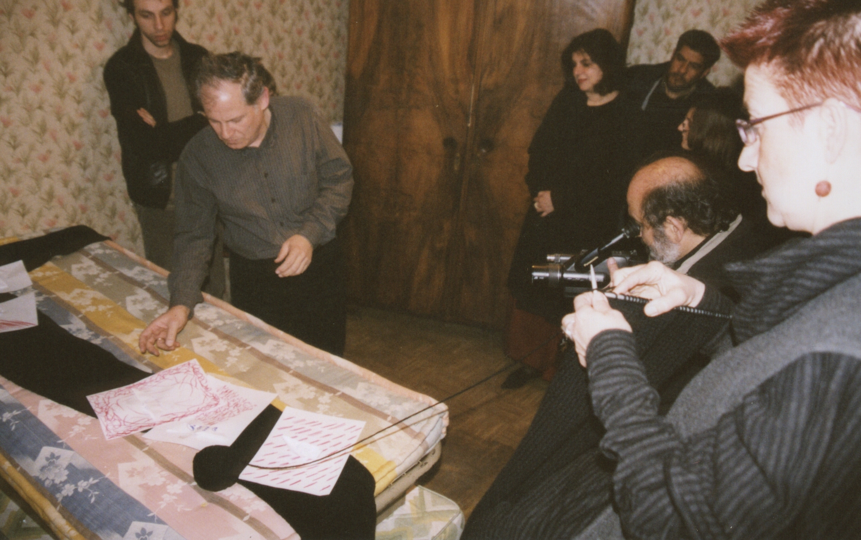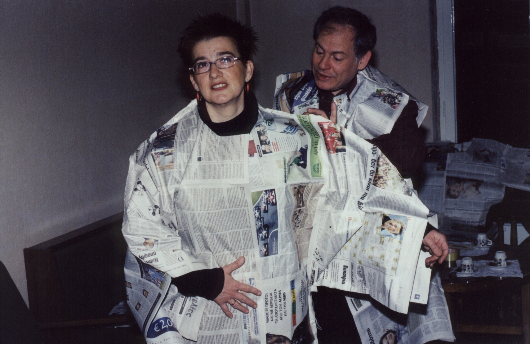 Current events are approached as collective everydayness and play a significant role in their work. In one of their final performances in 2004, on the day of the national elections, they sewed garments for themselves and attendees out of newspapers, while tapes of campaign speeches from the 1980s played in the background. In 2003, the group Brotherhood of Immaculate Liberation / 3A, which they had formed two years earlier with Hector Mavridis and Iordanis Stylidis, was activated during the American bombings of Iraq and participated in demonstrations demanding “the re-establishment of the horizon, of perspective, and of the future.” In these instances, the relationship between everyday life and art for Chondros/Katsiani becomes evident and is most succinctly encapsulated in the notion of behaviour.