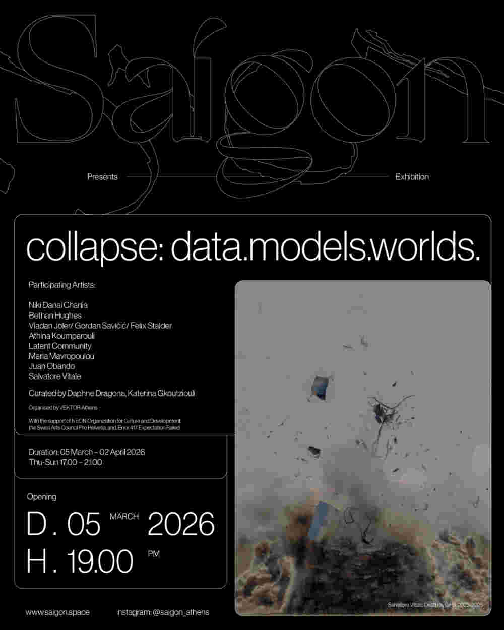 Η έκθεση collapse: data.models.worlds. πραγματεύεται την εντεινόμενη κρίση που βιώνει ο σύγχρονος κόσμος, διερευνώντας τον ρόλο της τεχνολογίας σε αυτήν. Λαμβάνοντας υπόψη, τρέχουσες συζητήσεις γύρω από τις δυνατότητες και τα όρια των τεχνολογικών υποδομών, εξετάζει τη σχέση αυτών με κοινωνικά και οικολογικά ζητήματα, από το παρελθόν μέχρι σήμερα.