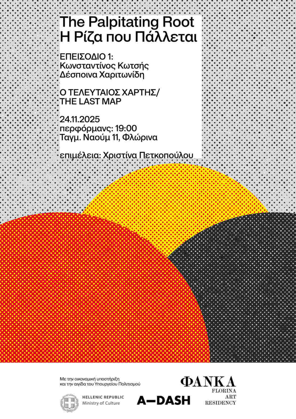 H σειρά εκθέσεων Η Ρίζα που Πάλλεται/Τhe Palpitating Root εγκαινιάζεται στις 24/11 στην πόλη της Φλώρινας και στρέφει το ενδιαφέρον στα μαγικά κανάλια που διατρέχουν τις σύνθετες πραγματικότητες, μέσα από έργα σύγχρονων καλλιτεχνών και καλλιτεχνιδών που θα προκύψουν από μια επιτόπια έρευνα στην ακριτική περιοχή, όπου η φύση, η πλούσια ιστορία και η πολλαπλότητα των παραδόσεων συνυπάρχουν σε ένα κινηματογραφικό τοπίο. Στο πρώτο επεισόδιο της έκθεσης, ο Κωνσταντίνος Κωτσής και η Δέσποινα Χαριτωνίδη θα παρουσιάσουν την επιτελεστική γλυπτική παρέμβαση Ο Τελευταίος Χάρτης στη γειτονιά της δημοτικής αγοράς και 24/11 στις 19:00 θα πραγματοποιήσουν περφόρμανς στην οδό Ταγματάρχου Ναούμ.
