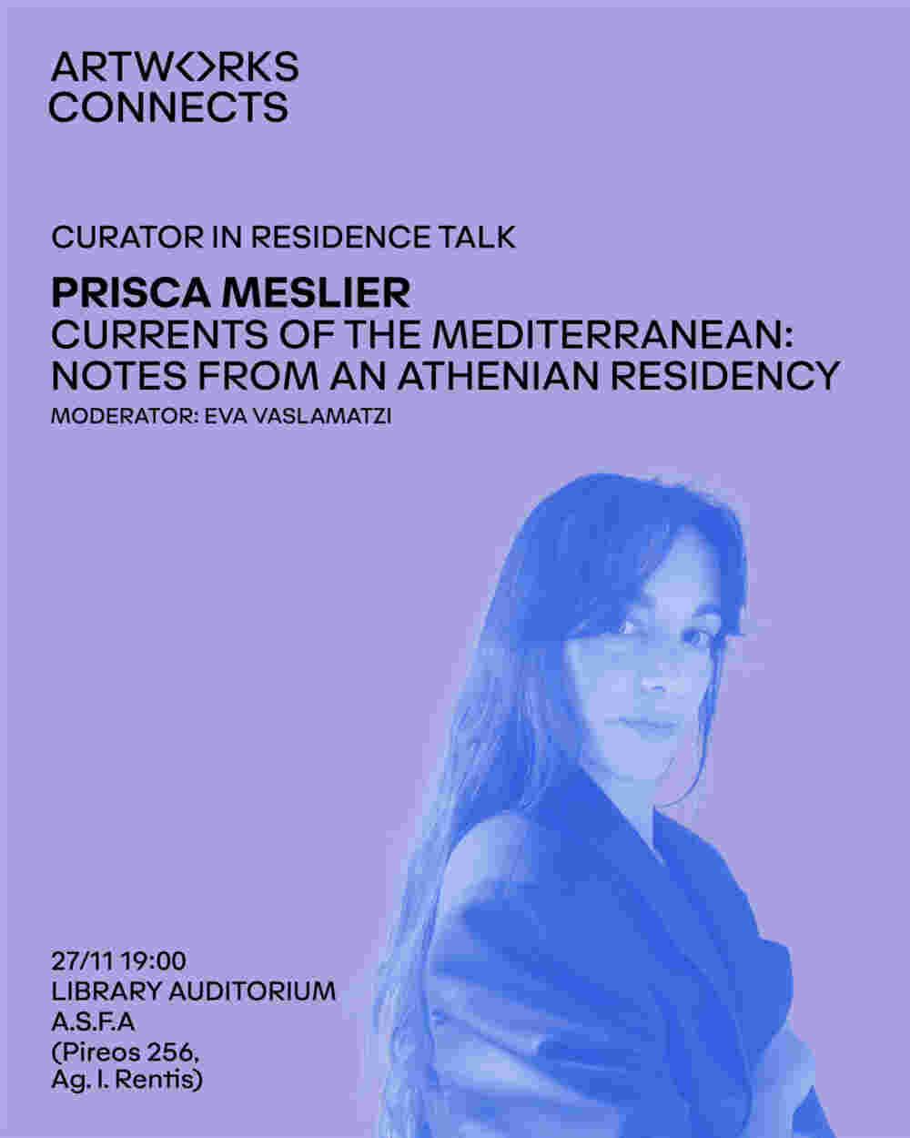 Την Πέμπτη 27 Νοεμβρίου, η Prisca Meslier έδωσε μια επιμελητική ομιλία, με συντονίστρια την αγαπητή μας συνεργάτιδα και επιμελήτρια Εύα Βασλαμάτζη. Κατά τη διάρκεια της συζήτησής της με την Εύα, η Prisca αναστοχάστηκε την εμπειρία της από τη φιλοξενία της στην Αθήνα και τον τρόπο με τον οποίο βίωσε την πόλη ως ένα μεσογειακό εργαστήριο, διαμορφωμένο από καλλιτεχνικές πρακτικές, συλλογικές και μη κερδοσκοπικές πρωτοβουλίες, καθώς και από δυναμικές ροές και ανταλλαγές.